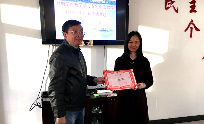 12月3日,昆明学院示范性师范生培养基地共建活动启动仪式暨数学系2016级师范生数学专业综合训练课开班典礼在安宁市实验学校进行。昆明学院副校长马银海出席启动仪式并为相关教师颁发聘书。安宁市基础教育中心主任李俊,昆明学院数学系、安宁实验学校相关领导和安宁实验学校杨玉萍、李所贵名师工作室负责人参加启动仪式。