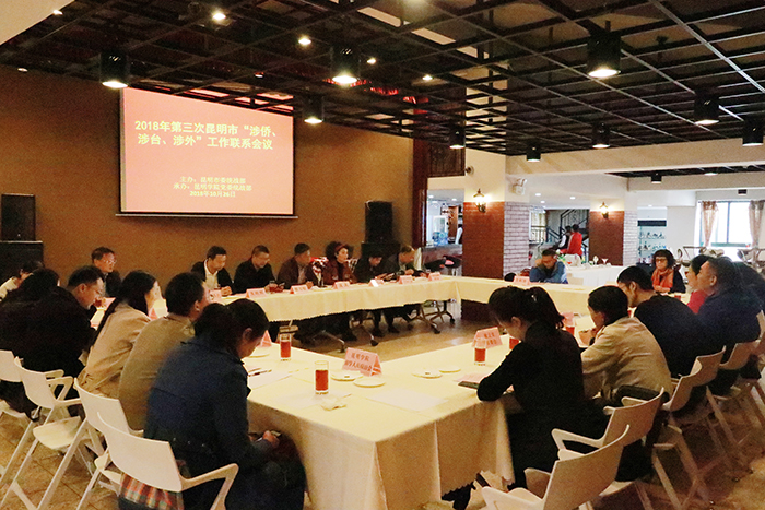 为深入学习贯彻习近平新时代中国特色社会主义思想和党的十九大精神,进一步加强昆明市 “涉侨、涉台、涉外”相关单位的联系和交流,10月26日,由昆明市委统战部主办,昆明学院统战部承办的2018年第三次昆明市“涉侨、涉台、涉外”工作联系会在我校召开。中共昆明市委统战部副部长贾玉华,昆明学院党委委员、副校长沈凡出席会议。市台办、市外侨办、市人大常委会民宗侨工委、市政协港澳台联络委、民盟市委会、民革市委会、致公党市委会、昆明学院留学人员联谊会等11家“三涉”成员单位参会。