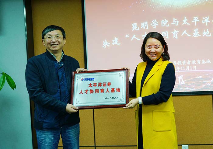 11月1日,昆明学院与太平洋证券股份有限公司共建协同育人基地——证券人才协同育人基地正式落成。基地本着“优势互补、资源共享、互惠双赢、共同发展”的原则,旨在提高行业企业参与办学程度,健全多元化办学体制,全面推行校企协同育人的目标,努力推进“引企入教”改革、加强产教融合师资队伍建设、创新教育培训服务供给和促进产教供需双向对接。