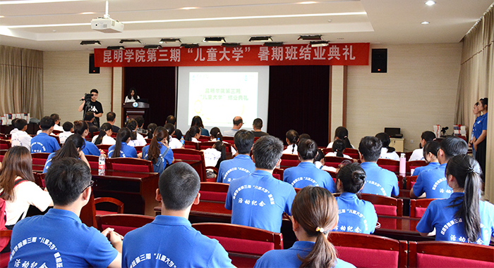 7月23日,由昆明学院、共青团昆明市委、昆明市禄劝县九龙镇政府主办的第三期儿童大学暑期班结业典礼在我校办公楼502报告厅举行。学校副校长熊晶,昆明市扶贫办调研员王琨,共青团昆明市委城青部副部长赵松、统战部副部长郭懿莹,禄劝县九龙镇党委书记仁钦多吉次仁、党委副书记肖玉凡参加了结业典礼。来自昆明学院扶贫挂联点的禄劝县九龙镇文林村、木克村和团市委挂联点东川区拖布卡镇象鼻村的30余名小学员圆满完成了第三期儿童大学暑期班各项参观学习任务,顺利结业。