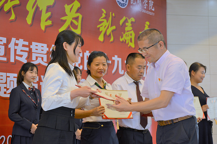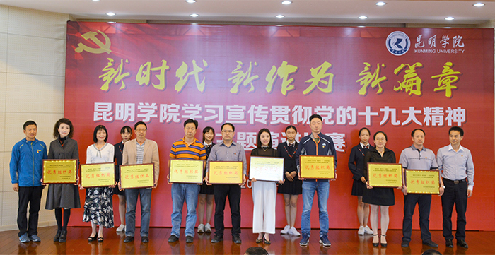 昆明学院学习宣传贯彻党的十九大精神主题演讲比赛自4月开始,在全校各党总支、直属党支部组织教职工初赛的基础上,最终推荐出23名选手进入学校决赛。在近两个月的学习演讲活动中,涌现出一批先进集体。在自愿申报基础上,经评审,机关党总支、自动控制与机械工程学院、农学院、数学系、物理科学与技术系、化学科学与技术系、马克思主义学院、图书馆、附属经开学校获得优秀组织奖。