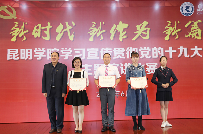 6月6日,“新时代 新作为 新篇章”——昆明学院学习宣传贯彻党的十九大精神主题演讲比赛决赛在办公楼D区三楼报告厅举行。学校党委书记陈永明,党委副书记张祖武出席活动并为获奖选手颁奖。云南省演讲学会会长李志勤、常务理事辛勤、赵志刚应邀担任评委。 来自学校基层党总支、直属党支部的23名选手,身着正装,声情并茂围绕党的十九大精神,结合个人本职工作、所思所学,用激情昂扬的演讲状态、真实鲜活的工作事例和富有创新的舞台表现,从不同角度讲述了高校教职工的“新时代、新气象、新作为”,畅谈对党的十九大精神的深刻理解和认识,讴歌了党的光辉历程,抒发了对党的炙热情怀,展示了培养中国特色社会主义建设者和接班人的责任与担当精神。选手们的精彩演讲赢得了现场听众的阵阵掌声和喝彩。 经过激烈角逐,来自农学院的杨伟、音乐学院的周丹、附属经开学校的赵无颜以高分同获一等奖,并分别包揽“最佳稿件奖”、“最佳风采奖”、“最佳创意奖”三个单项奖。