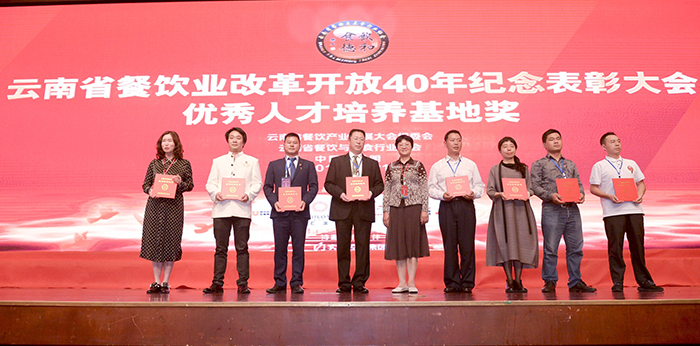 会上,昆明学院旅游学院荣获大会颁发云南省餐饮业改革开放40年优秀人才培养示范基地,旅游学院院长田芙蓉代表学院受奖。