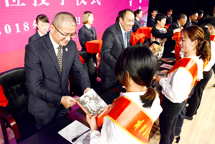 会上,教师代表,行政管理人员代表,后勤服务人员代表上台接受毕业生代表行谢师礼。