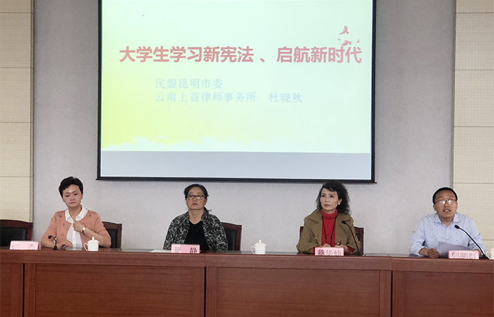 5月30日,昆明学院与民盟昆明市委联合主办的第三期“法律讲堂”在我校开讲。民盟昆明市委法律宣讲团团长、法学博士杜晓秋应邀主讲《学习新宪法》。民盟云南省委副主委、昆明市政协副主席、民盟昆明市委主委夏静,昆明学院党委统战部、社会管理学院负责人以及昆明学院统一战线教师代表,社会管理学院、学特学院学生代表共两百余人参加了活动。