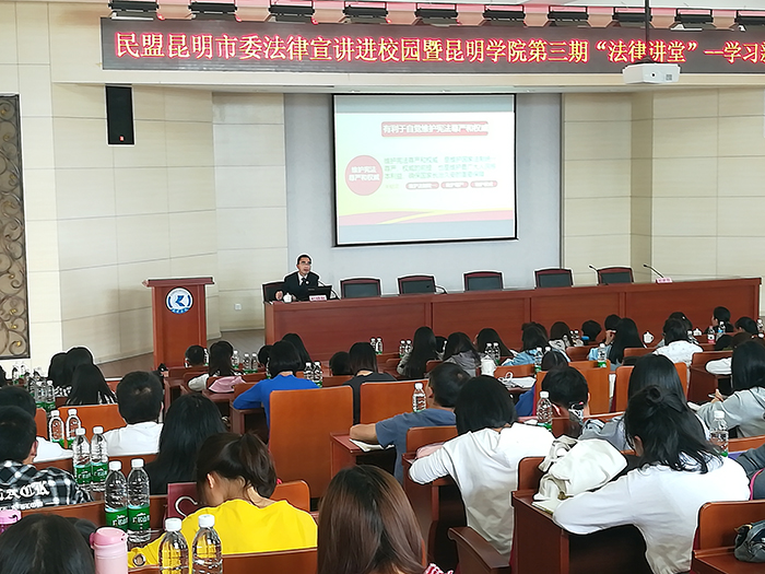 学校党委统战部部长蔡华仙介绍说,从2014年开始,民盟昆明市委与昆明学院合作,利用昆明学院“法律讲堂”宣传阵地,已经展开了多次有成效的法律服务活动,受到了昆明学院师生的广泛欢迎。希望“法律讲堂”成为昆明市法制宣讲活动的知名品牌,成为法制校园建设的重要推手。