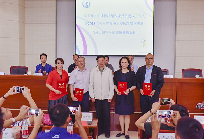 姜征明会长将跳绳专业委员会的牌匾授予昆明学院,并宣布跳绳专业委员会聘任周明教授担任主任,叶燎昆、李素文任副主任。来自全省各地的160位中小学体育教师以及部分体育学院师生参加了成立仪式,共同见证了昆明学院在云南省学校体育工作中的又一项优异成绩和新的贡献。