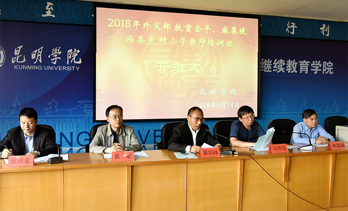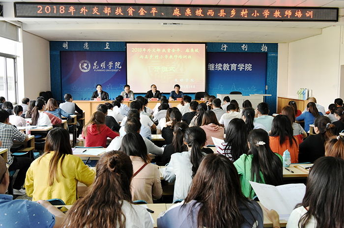 5月14日,2018年外交部扶贫金平、麻栗坡两县乡村小学教师培训班在昆明学院继续教育学院开班。省政府外事办副主任夏剑峰、外事办人事处处长袁宏、机关党委专职副书记肖国祥,昆明学院副校长马银海等领导出席开班式。来自金平、麻栗坡两县的100名乡村小学教师参加了开班式。