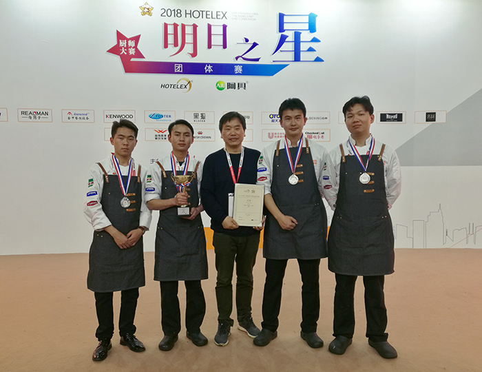3月29日,华南赛区冠军队-小白天鹅、华北赛区冠军队-波尔塔二十西班牙餐厅、西南赛区冠军队-The River House以及华东赛区冠军、亚军、季军等来自行业餐厅、大专院校的八支队伍展开竞技。我校代表队克服身体疲惫状态,严格按照西餐国际大赛的要求,充分展示了自身优良的职业素养和娴熟的西式烹调技艺,以完美的配合和稳定的发挥圆满完成了比赛,最终获得“2018 HOTELEX 明日之星”厨师大赛全国总决赛的季军。