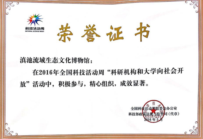 我校滇池流域生态文化博物馆在培训班还获得了全国科技活动周组委会办公室、科技部政策法规与监督司颁发的“科技活动周 荣誉证书”。
