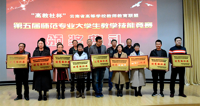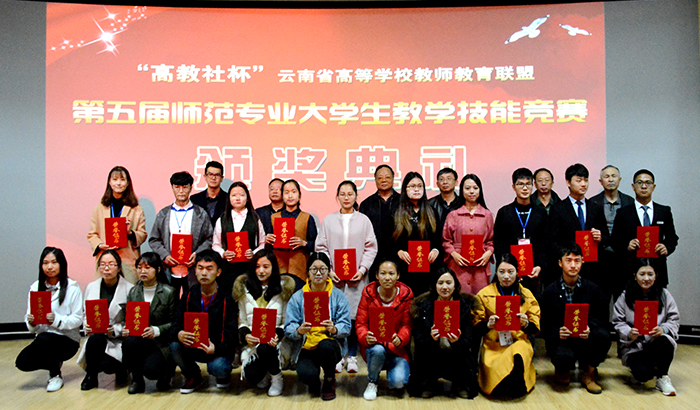 12月15日,由云南省高等学校教师教育联盟主办,昆明学院承办,昆明市官渡区第一中学、昆明市昆明市官渡区第六中学、昆明市官渡区东站实验学校、昆明市官渡区经开实验小学协办的“高教社杯”云南省高等学校教师教育联盟第五届师范专业大学生教学技能大赛颁奖典礼在我校旅游学院3D报告厅举行。 省教育厅高等教育处正处级调研员谢怀昆,联盟副理事长、云南师范大学副校长马力,我校副校长马银海,联盟副秘书长、教务处、教师教育学院、高等教育出版社云南省教学服务中心等相关职能部门以及联盟高校参赛选手、指导教师、评审专家、带队领导参加了颁奖典礼。 副校长马银海主持会议并致辞。他代表大赛组委会向在大赛中取得优异成绩的各位选手和单位表示祝贺,向指导教师、评审专家、参赛选手表示感谢。马副校长指出,高校师范生教学技能是建设基础素质、综合素质的具体体现,是知识、能力、价值、态度、情感的统一体。此次技能竞赛对师范专业的同学们来说是人生的一次宝贵历练。今天同学们同台竞技,取得优异的成绩,是你们刻苦学习、勤于实践的结果。希望同学们学会反思竞赛中的得失,练就扎实的专业功底,励志做“有理想信念、有道德情操、有扎实学识、有仁爱之心”的好老师。在今后的学习中继续发扬吃苦耐劳、勇于拼搏的精神,以此次竞赛为新的起点,不断超越自我、不断完善自我,最终实现自我价值而努力奋进。 省教育厅高等教育处正处级调研员谢怀昆在会上讲话。他首先感谢联盟各学校、高教社长期以来对教师教育联盟工作的大力支持,感谢昆明学院承办此次竞赛所付出的辛勤劳动。并祝贺在竞赛中取得优异成绩的参赛选手和学校。谢怀昆调研员在会上阐述了当前高等教育的发展现状和趋势。他指出,教师教育是国家培养的重要人才,百年大计教育为本,教育大计教师为本,教师教育是发展教育的重要源动力。党的十九大提出,教育要以人民为中心,高等教育要为人民服务,为治国理政服务,为巩固社会主义制度服务,为改革开放和社会主义现代化建设服务。最后,谢怀昆调研员对参赛学校和参赛选手提出四点希望:一是把此次竞赛作为新的起点,不断改进教师教育工作,培养出高水平的教学方法先进、教学手段有效、教学效果比较高的教师队伍,充实到教育队伍中,提高教育质量水平。二是通过此次竞赛,从中找不足找差距,不断总结教学工作。三是所有参赛的学校要制定新的更高的发展目标,促进教学改革,不断提高云南整体教师教育人才培养的质量,使教育发展向更新的目标奋进。四是联盟各成员单位,要做好联盟平台的宣传工作,不断总结竞赛经验,进一步把联盟平台做大做好。 联盟常务副秘书长、云南师范大学教务处副处长匡锦在会上宣读获奖名单。参会领导为获奖选手和单位颁发获奖证书和奖牌。