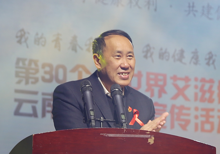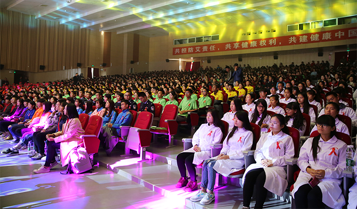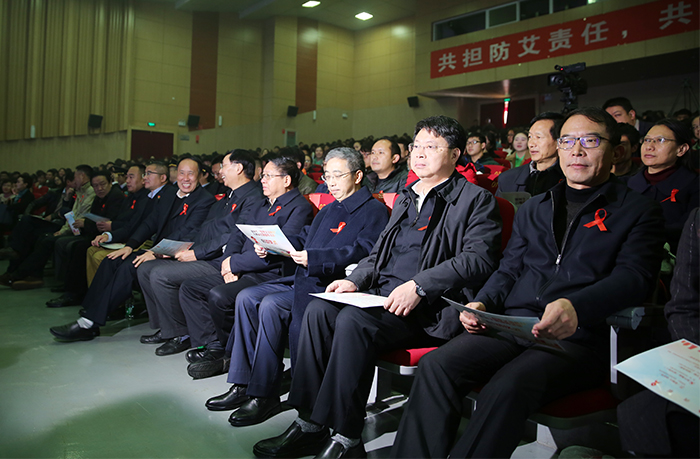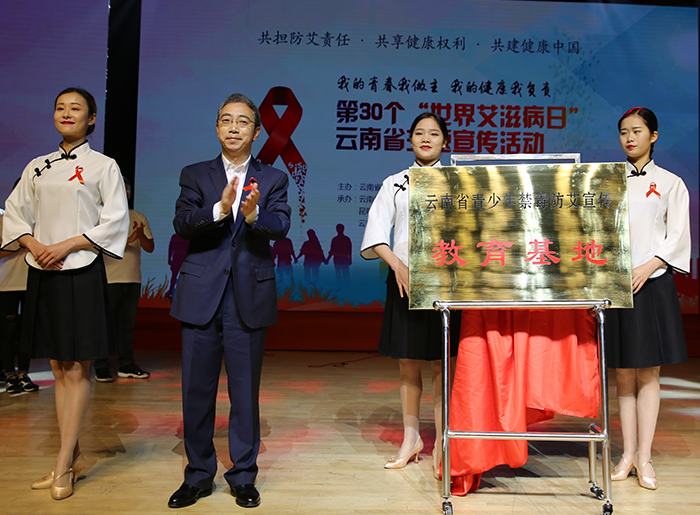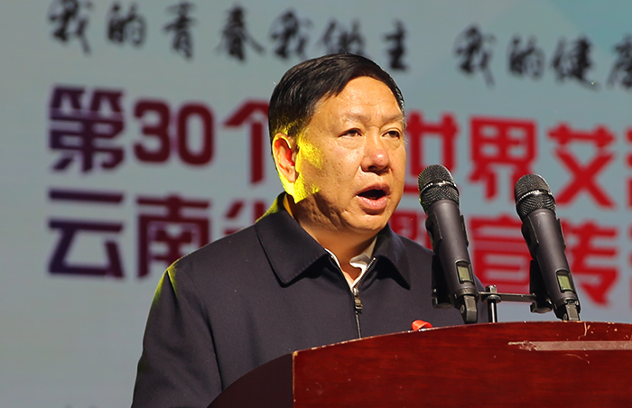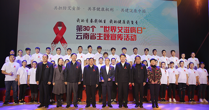 11月30日上午,由云南省防治艾滋病工作委员会主办、云南省防治艾滋病局、昆明学院、云南省性病艾滋病防治协会承办的“我的青春我做主 我的健康我负责” 第30个“世界艾滋病日”云南省宣传活动启动仪式在我校学生会堂举行。 云南省人民政府副省长陈舜,省政府副秘书长赵瑞君,省卫生计生委党组书记王灿平,省教育厅副厅长赵德荣,省性病艾滋病防治协会会长陈觉民,昆明市政府副秘书长王亚芳,学校党委书记陈永明, 长黎素梅等领导出席了启动仪式。省防艾委、市防艾委成员单位相关负责同志,我省高校防艾教育基地学生代表,我省医务人员、志愿者、农民工代表与我校师生1300余人共同参加了本次活动。 学校党委书记陈永明代表承办方致辞。陈书记首先代表昆明学院党政和全体师生向莅临我校的各级领导、来宾表示衷心的感谢;向出席开幕式活动的各兄弟院校领导表示热烈的欢迎;向长期抗战在防艾工作第一线工作人员及志愿者们致以崇高的敬意。 陈书记指出“共担防艾责任,共享健康权利,共建健康中国”是我国今年世界艾滋病日宣传活动的主题。这一主题充分阐释了健康是促进人类全面发展的必然要求,也是广大人民群众的共同追求。 陈书记介绍“一直以来,我校高度重视艾滋病的防治与宣传教育工作,初步形成了‘成立领导小组统筹抓,推进三级联动层层抓,发挥三支队伍作用持续抓’的工作局面。” 陈书记表示我校在艾滋病防控宣传教育工作取得成绩的同时,也清醒的意识到防艾治艾总体情况还不容乐观,防艾治艾工作还任重道远。 云南省卫生计生委党组书记王灿平同志致辞。首先,王灿平书记代表云南省尾声计生委对昆明学院以及有关部门和单位为本次活动的顺利举行提供的支持和帮助表示感谢。接着,王书记针对云南省防治艾滋病的整体情况进行了介绍,特别强调青少年要加强个人保护意识和风险识别意识。针对大学生艾滋病病毒感染率的高发,云南省教育厅,云南省卫生计省委定期召开省高校艾滋病报告会,积极开展各类教育宣传活动以及艾滋病检测活动。 继王灿平书记致辞,围绕本次世界艾滋病日云南省宣传活动的主题“我的青春我做主 我的健康我负责”,昆明学院各院系为来宾们奉上了精彩的文艺节目。由我校体育学院来的体育舞蹈《青春之舞》动感十足,展现青年们的热情和活力。