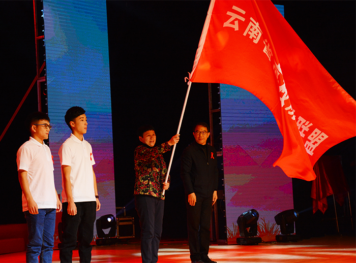 两个精彩的节目之后,云南省预防艾滋病宣传员刘伟带领青年志愿者代表们上台宣读了“云南省高校防艾联盟倡议书”。来自不同高校的同学以及青年志愿者们郑重地宣读“云南省高校防艾联盟”倡议,表明青年们防治艾滋病和追求健康美好生活的决心。 云南省教育厅赵德荣副厅长为昆明学院授“云南省高校防艾联盟”旗,昆明学院黎素梅校长接旗。