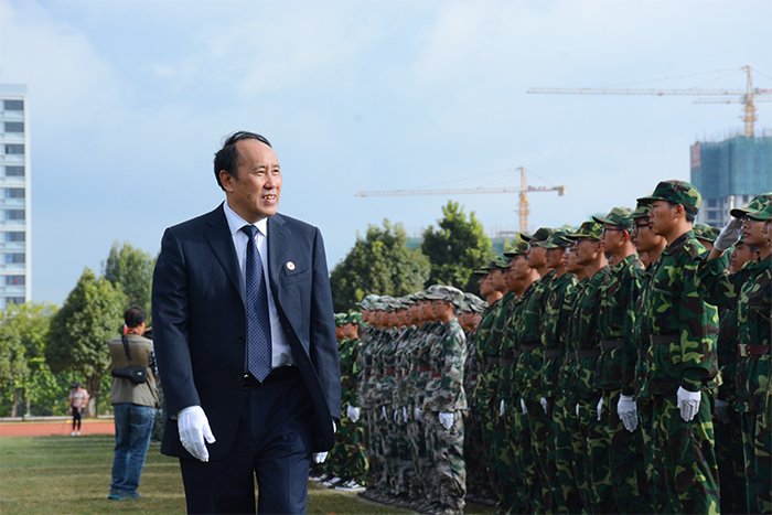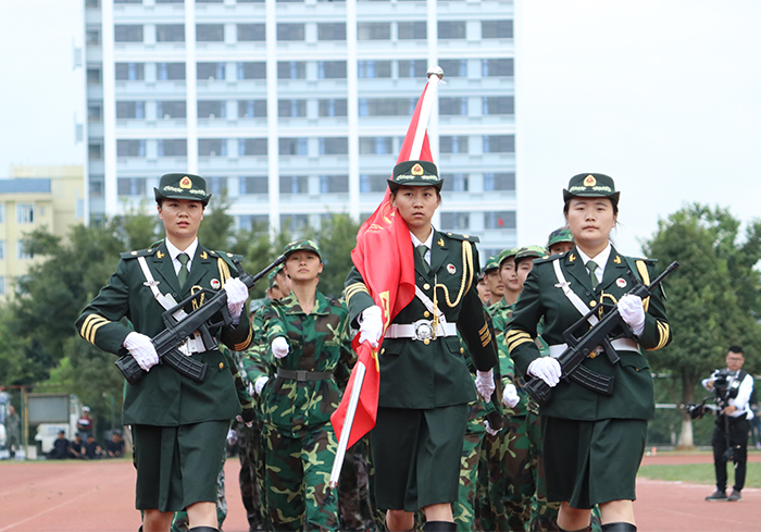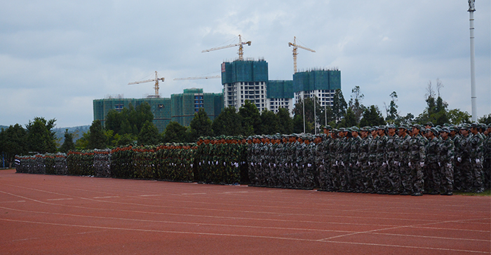 9月30日,我校在田径场举行2017级新生军训汇报表演暨总结表彰大会。学校党委书记陈永明,校长黎素梅,党委副书记张祖武,副校长郭华、董建华、马银海、沈凡,副校级领导孙勇,武警边防士官学校副校长李荣、训练部部长任洪川、训练部副部长赵立志、业务系主任高忠良、教育处处长唐业宏和官渡区人民武装部政委周文斌出席大会。 4800余名同学时刻保持着“坚韧不拔、毫不松懈、永不服输”的精神,在14天的军训过程中,不畏烈日当空,不惧风吹雨打,克服小伤小痛,顺利地完成了军训。今天,他们精神饱满,整装待发,时刻准备着接受领导检阅。 汇演进行第一项,奏国歌,迎国旗。庄严的国歌响起,全场肃立,护旗队高举五星红旗,缓缓走过队列。迎国旗完毕,党委书记陈永明检阅军训方队,当陈书记走过方队时,嘹亮的口号带着无限的活力,响彻整个校园,“首长好!”“为昆院争光!”同学们斗志昂扬,意气风发,将14天的军训成果展现得淋漓尽致。在《歌唱祖国》的乐声中,标兵就位,分列式开始。国旗护卫队是汇演方队的排头兵,持枪方队、各营方队、国旗班紧随其后。分列式场面宏大,气势非凡。 分列式完毕,军事训练科目汇报表演开始。第一个表演的是队列操方队,40多位女同学将舞蹈艺术和军事动作融为一体,用杨柳般婀娜的身姿为我们上演了美轮美奂的视觉盛宴。在钢与柔的环境反差下,女子队列方块登场了,她们身着迷彩服,手戴白色手套,随着队形变幻出欢庆党的十九大的图案,整个画面流畅整齐,现场掌声不断。擒敌方队的361名同学汇编成19行19列的方队,寓意喜迎党的十九大的召开。在一声声“杀杀杀”中,女生匕首操表演有序进行,她们用简单而又准确的动作展现出敢于拼搏的精神。 汇演结束后,党委副书记张祖武宣读了《关于表彰昆明学院关于2017级学生军训优秀集体,优秀个人的决定》。与会领导们为内务优秀宿舍、军训优秀学员、优秀带队教官代表、优秀辅导员颁奖。外国语学院2017级英语1班的徐满笑同学作为军训优秀学员代表发言。 最后,校长黎素梅作总结讲话,她对同学们提出了三个希望:一是希望同学们能在今后的学习生活中保持、巩固和发扬在军训过程中用辛勤汗水换来的好作风、好品质把军训成果转化为刻苦学习和积极生活的动力。二是希望同学们能发扬脚踏实地、百折不挠的精神。三是希望同学们能继续巩固和发扬集体主义精神。