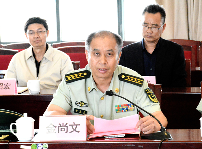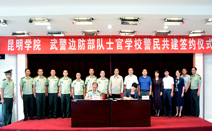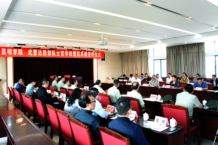 武警边防部队士官学校政委金尚文大校在会上首先感谢昆明学院多年来对武警边防部队士官学校的帮助和支持。他说,两校警民共签约仪式在昆明学院举行,意义重大而深远,标志着两校警民共建又迈上一个新的合作高度。昆明学院是一所学科门类最齐全的本科院校,在近几年来的办学、育人建设发展中,取得了令社会瞩目和认可的成就,为地方经济社会发展培养了大批的社会所需人才。2012年两校就签订警民共建协议,多年来,两校在军训、国防教育、教育教学、人才培养、文体活动等方面进行了良好的交流合作,取得了预期效果,进一步加深了两校之间的深厚友情。他强调,警民共建,警民合作,是适应国家军民融合战略发展的需要,也是两校办学发展之需要。双方要充分利用好这个合作共赢的平台,在警民共建中取长补短,实现办学育人资源共享,实现互利共赢。金政委表示,武警边防部队士官学校将利用自身特有的办学资源,为昆明学院进一步做好新生军训、爱国主义教育和国防教育。通过警民共建达到三个更进一步:一是更进一步加强双方在党建联创联建工作上的交流合作,以党建带团建,充分发挥党在两校中的模范先锋和战斗堡垒作用;二是更进一步加强两校师资队伍建设与交流,广泛加强学术、科研及信息化的合作;三是更进一步加强双方管理经验上的交流,共促两校在办学育人管理上再上一个新台阶。