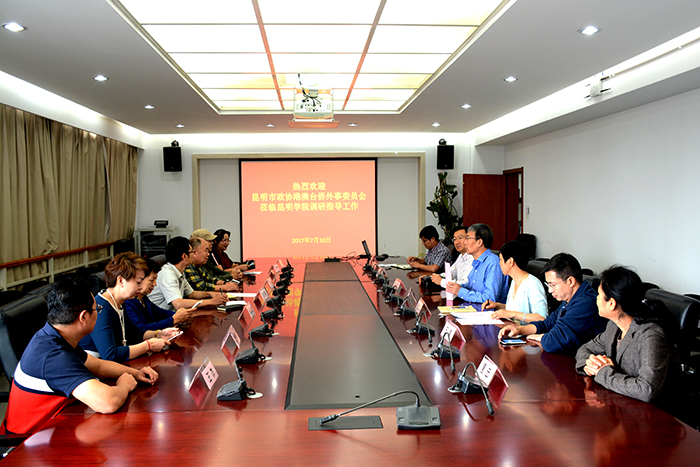 7月10日,昆明市政协港澳台侨外事委员会到我校专题调研海外高层次人才引进工作。市政协港澳台侨外事委员会主任庞博河、副主任孙美丽,市政协调研员王雄伟、石美珍,市政协委员、昆明市规划局经开分局副局长秦笠洪,金诺教育集团董事长王杰、昆明市延安医院何渝春,市政协信息中心张颖等参加调研。