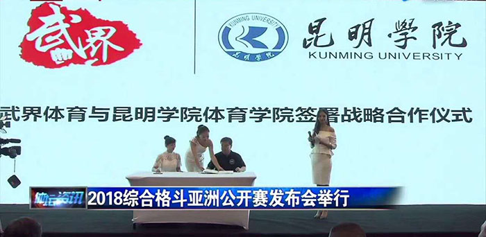 我校体育学院徐立宏老师代表昆明学院体育学院在新闻发布会上与CIMMAF签署战略合作协议,并在活动中接受了多家中外媒体的采访,全面介绍了昆明学院校情和体育学院的特色,并代表体育学院邀请IMMAF(国际综合格斗联合会) CEO Dengisn White先生到昆明学院考察交流。