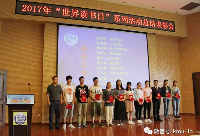 6月9日,昆明学院2017年“世界读书日”系列活动总结表彰会在图书馆报告厅举行。学校副校长郭华,图书馆、学生处、校团委及各院系领导,阅读之星、各项活动奖项获得者、图书馆部分老师及学生代表参加了表彰会。