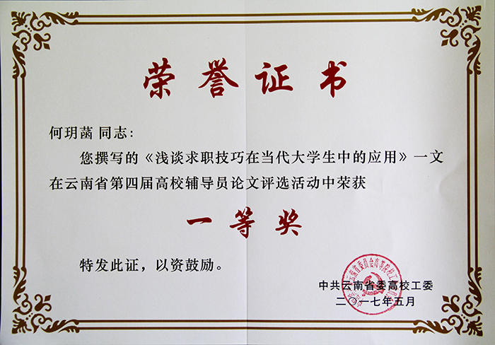 云南省第四届全国高校辅导员工作优秀论文评选,我校推荐报送的四篇参评论文有两篇分获一、二等奖,其中美艺学院辅导员何玥菡老师的论文《浅谈求职技巧在当代大学生中的应用》获一等奖,旅游学院辅导员金刚老师的论文《浅谈高校辅导员的工作担当与责任》获二等奖。