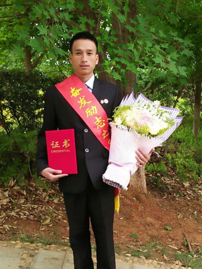 他并没有因家庭贫困而消沉,反而直面逆境,迎难而上,立志要为国家教育事业的发展做出自己贡献的他,学习刻苦,成绩优异,不断钻研自己的专业知识,专业成绩在本专业名列前列,大学期间以第一名的成绩告别了高考招生录取时的最后一名。通过努力,他于2015-2016学年荣获云南省人民政府奖学金、2014-2015学年荣获国家励志奖学金、2015-2016学年被学校评为五四青年“青春之星-奋发励志之星”、2015-2016学年评为校级三好学生;两次国赛两次校赛三次区域赛七篇万字学科竞赛科技论文,担任队长的他带领不同的组员摘取了多个奖项,2016年全国大学生数学建模竞赛国家二等奖、2015高教社杯全国大学生数学建模竞赛云南赛区三等奖、学校第五届大学生数学建模竞赛一等奖以及大学期间参加各级各类专业学科竞赛(CUMCM、APMCM、MathorCupMCM、CACIMCM)获得三等奖。
