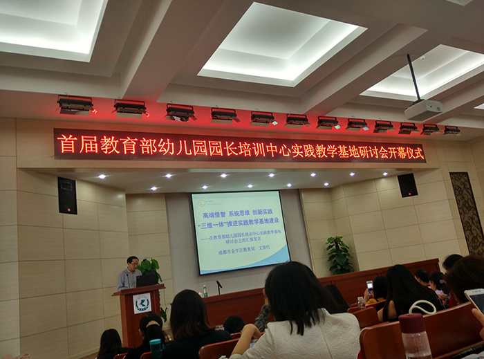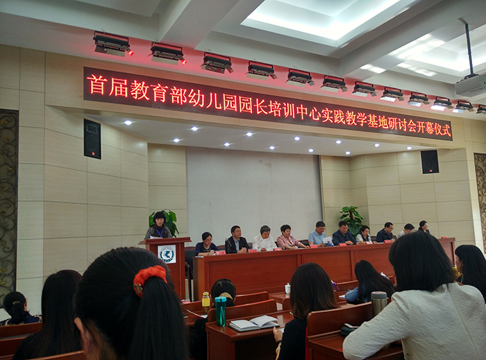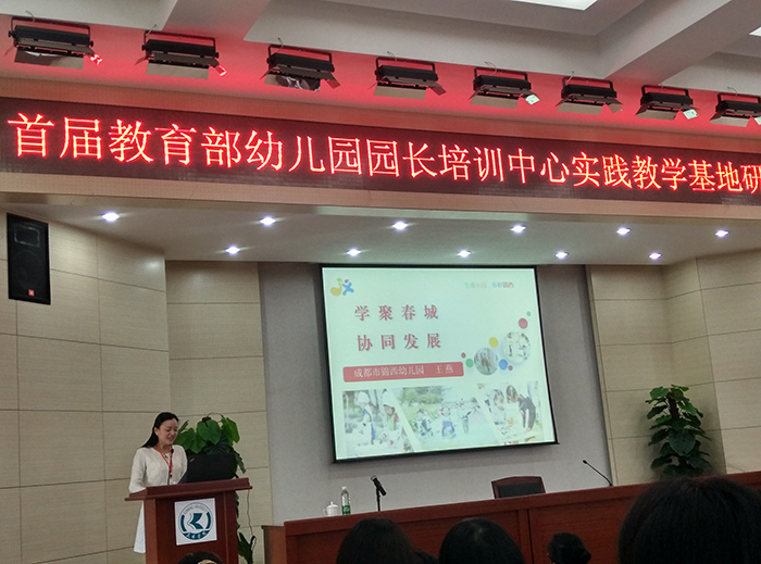 实践教学基地园长代表缪珺老师致辞,对教育部幼儿园园长培训中心提供的学习、成长空间表示感谢,期待国内外学前教育专家给以指导,期待着培训中心、学前教育领域加强交流合作。