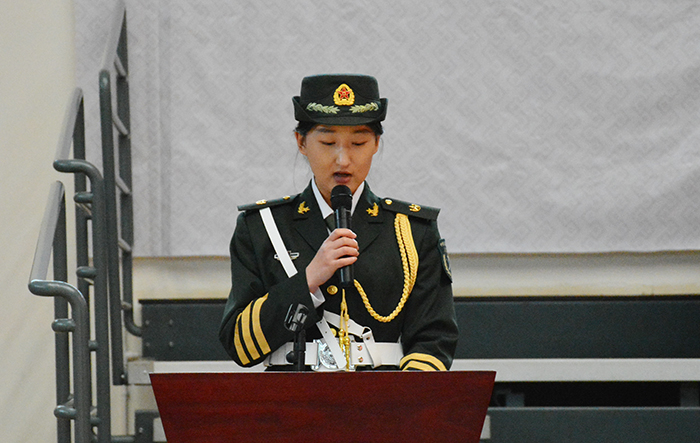 旅游学院2016级学生殷怡龙作为民兵代表发言。她表示,在今后的发展过程中,民兵连要继续发扬艰苦奋斗的优良作风,认真学习军事思想,进一步完善工作制度,增强法治观念,努力完成学校交付的各项工作,充分发挥队伍先进性,做好先锋模范作用,让民兵连成为昆明学院的光荣与骄傲。