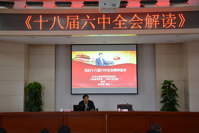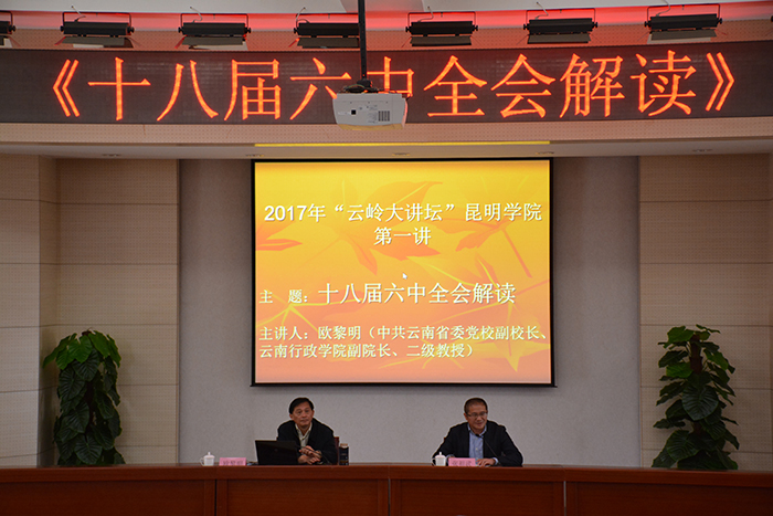 4月7日,由省委宣传部、省社科联主办,昆明学院党委宣传部、机关党总支、昆明科学发展研究院共同承办的“云岭大讲坛﹒昆明讲坛(昆明学院)”第一讲在昆明学院开讲。云南省委党校副校长、云南行政学院副院长欧黎明教授应邀主讲《十八届六中全会解读》。学校党委副书记张祖武主持报告会。