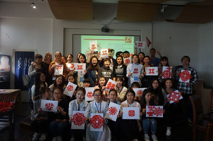 欢迎见面会后,挪威NLA大学师生一行人到我校体育馆、青年活动中心、美艺学院开展了一系列的交流文化活动。外国语学院学生为挪威师生展示了怎样包饺子,并邀请挪威师生体验包饺子的过程。美艺学院的蒋老师向来访客人展示了自己的剪纸作品。双方的同学还就各自的大学生活和英语学习展开了细致地讨论。