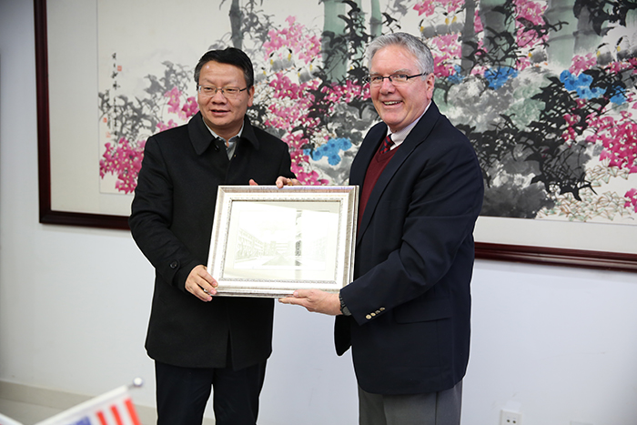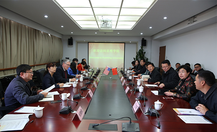 2月27日,在昆明市副市长孙涛的陪同下,美国康伯斯威尔大学执行副校长H.Keith Spears教授、中国项目负责人郭浩博士、中国顾问刘迎春一行到我校交流访问,就双方发挥教育优势,开展全方位、深层次合作项目进行磋商,双方达成合作意向并签署合作备忘录。 我校党委书记陈世波、校长黎素梅、副校长熊晶接待了来宾,对来宾表示欢迎,并介绍了学校办学情况、办学特色和优势,表达了合作意向,提出了合作愿景和目标要求。