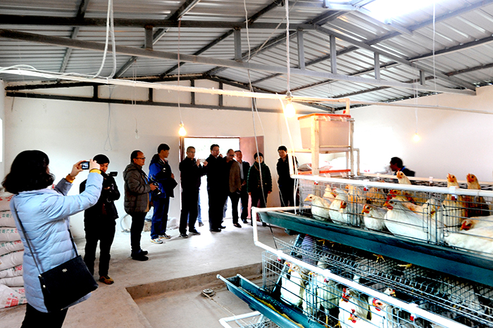 揭牌仪式结束后,陈世波书记一行在县、乡领导的陪同下,冒着细雨,踏着泥泞,先后深入到蛋鸡养殖场、竹筷加工厂、腊哈小学和幼儿园建设工地查看了解生产建设情况。