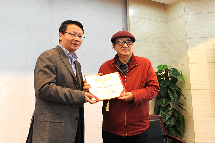陈书记代表学校宣布聘任决定:聘请黄宏将军、钟开天先生为昆明学院客座教授,同时聘请钟开天先生担任昆明学院美术与艺术设计学院名誉院长。陈书记向两位专家颁发了聘书。