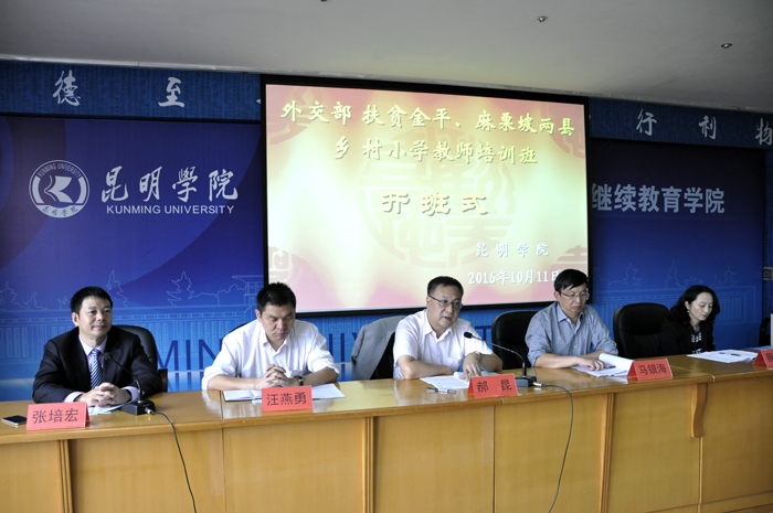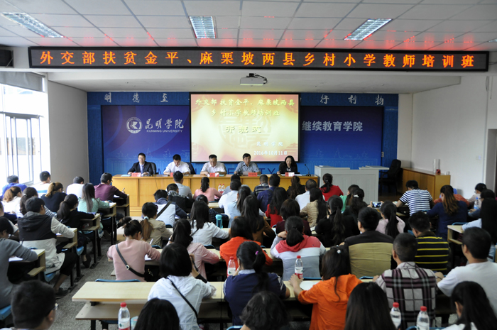 10月11日,2016年外交部扶贫金平、麻栗坡两县乡村小学教师培训班开仪式在昆明学院继续教育学院举行。云南省人民政府外事办公室副主任郝昆、昆明学院副校长马银海、省外办国际交流处处长汪燕勇、省外办人事处副处长蔡秋雁、省外办外事培训中心副主任刘芸出席开班仪式。省政府外事办及昆明学院继续教育学院相关职能部门的同志、金平与麻栗坡两县的100位乡村小学教师一起参加了开班式。开班式由昆明学院继续教育学院主持工作副院长张培宏同志主持。