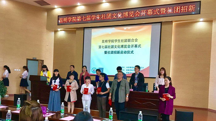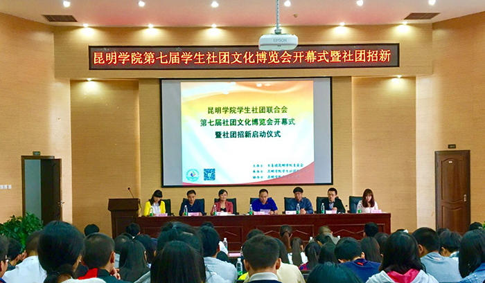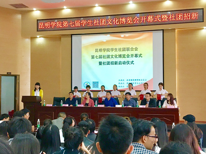 10月12日,由学校团委主办,学生社团联合会承办,昆明学院各学生社团协办的“昆明学院第七届学生社团文化博览会开幕式暨社团招新启动仪式”在图书馆报告厅隆重举行。昆明学院副校长郭华,党委宣传部部长李剀,团委书记魏妮娅,学生处处长晁丽华,团委副书记聂铭,教务处教材教室科副科长段建平,团委全体干部以及各院系团总支书记,部分社团指导老师,各高校代表,明星社团及优秀社团代表共200余人参加了本次活动。开幕式由团委书记魏妮娅主持。
