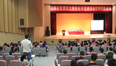 5月19日下午,我校联合昆明市官渡区武装部在学生会堂共同举行2016年大学生征兵昆明学院专场宣讲活动,并向学生提供征兵现场咨询服务。官渡区武装部部长李斌、副部长李智勇、昆明学院武装部副部长吴向东出席宣讲活动。来自我校各院系的学生代表1200余人参加了宣讲活动,宣讲活动由吴向东副部长主持。