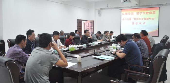 4月20日上午,昆明学院与安宁市合作共建“教师专业发展中心”签字仪式在安宁市教育局会议室举行。校长助理马银海教授、教师教育学院副院长常进荣教授、教务处副处长吴晓柏、教务处实践教学科陈超老师以及安宁市教育局肖局长、罗副局长、安宁市教师进修学校校长彭德、安宁市部分中小学校长等20余人参加了此次签字仪式。