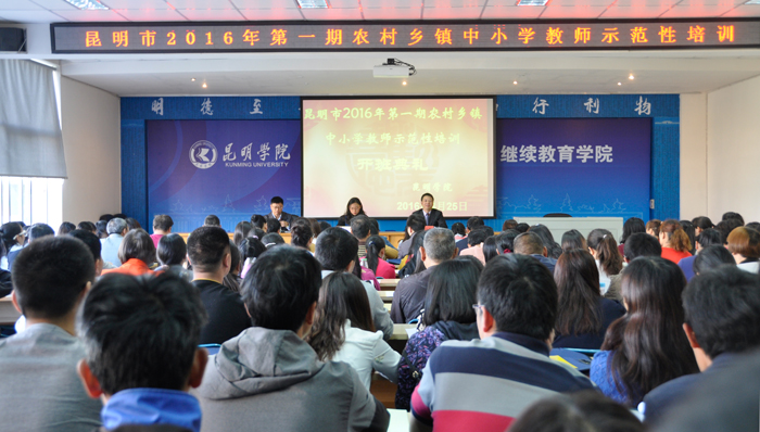 4月25日上午,昆明市2016年第一期农村乡镇中小学教师示范培训在昆明学院昆师路校区开班。昆明市教育局副局长李瑞林、昆明学院继续教育学院副院长张培宏出席开班式并作动员讲话。参加本次培训的200名学员分属初中语文、初中数学、初中英语及初中物理4个学科,每学科50人,来自昆明市各县(市、区)及滇中新区的农村乡镇初级中学。