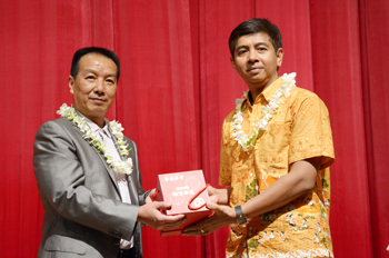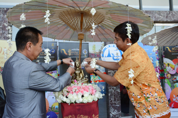 文艺表演前,举办了“浴佛仪式”, Korakot Opas先生和李翔副校长带领大家用水泼洒在佛像上,以虔祈福德。随后李翔和Korakot Opas先生分别致辞,并相互交换礼物。