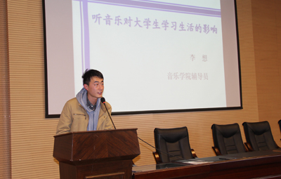 3月31日下午,昆明学院“辅导员讲坛”第九讲在图书馆报告厅开讲,本讲主题为《 听音乐对大学生学习生活的影响》,由我校音乐学院辅导员李想主讲。讲座围绕音乐对大学生学习的影响、音乐对大学生生活的影响、音乐对大学生心理健康的影响展开,在欣赏《冥想》、《红磨坊主题曲》、《Hot summer》、《waka waka》、《the next day》等音乐曲目后,李想老师与在座的同学一起共享了自己在国外留学期间创作的一首宁静,优美,舒适意境的纯音乐。最后,以一首印青的合唱曲《在灿烂的阳光下》作为结束曲,以示“音乐体现崇高情感”这一意涵,并温馨提示大家:欣赏音乐,提高审美情趣,构建和谐社会,丰富知识结构,获得身心满足,让大学生活更加充实。