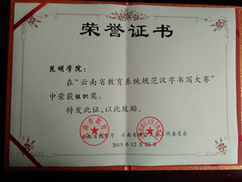 为贯彻落实《国家中长期语音文字事业改革和发展规划纲要(2012-2020)》、《教育部关于中小学书法教育的意见》、《国家语委、中国书法家协会关于开展“书法名家进校园”活动的通知》等文件精神,省教育厅、省语言文字工作委员会、省文学艺术界联合会主办了“2015年云南省教育系统规范汉字书写大赛”,昆明学院在此次比赛中荣获优秀组织奖。