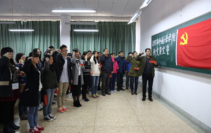 最后,陈世波指出,实现“十三五”时期发展目标,前景光明,任务繁重。需要全党全国各族人民更加紧密团结在党中央周围,万众一心,艰苦奋斗,奋力夺取全面建成小康社会决胜阶段的伟大胜利,为中华民族伟大复兴作出新的更大贡献。陈世波要求,各位新党员、入党积极分子会后要进一步加强学习,准确把握、深刻领会党的十八届五中全会精神内涵,把思想和行动统一到全会的精神上来;要按照全会精神,加强党性修养,坚定理想信念,发挥党员先锋作用,学生党员带头学好知识,历练本领,为“两个一百年”奋斗目标贡献力量作好充分准备;教师党员要潜心教书育人,充分发挥学科优势,积极投身全会精神的理论研究,推出有深度、有分量的研究成果,要认真研判学校发展面临的形势和任务,厘清改革发展的重难点问题,切实将全会精神落实到学校改革发展的各项工作当中,为学校发展不懈奋斗。