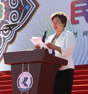 昆明学院副校长熊晶代表学校致欢迎词,向各位领导、嘉宾、获奖设计师以及各高校的老师同学们表示欢迎,感谢活动主办单位对学校的信任、感谢云南省教育厅、石林县人民政府及云南奥斯迪服饰公司等单位对我校承办该活动的支持和帮助。熊晶说,实现中华民族伟大复兴需要中华文化繁荣兴盛,文化是民族生存和发展的重要力量。中国是一个多民族国家,少数民族文化是中华民族最宝贵的文化资源,它是各民族在社会发展过程中创造的物质文明和精神文明的总和。民族服饰是一个国家民族文化的重要组成部分,在现代化和经济全球化的背景下,民族文化的传承对于维护民族多样性,促进经济、社会的发展和推动社会主义文化的大繁荣、大发展具有十分重要的意义和作用。熊晶指出,云南作为多民族聚居之地,拥有26个民族,民族文化底蕴丰厚,服饰多姿多彩、风格独特。云南要高度重视民族服饰的开发,并要求高校要发挥人才学科优势,为云南省文化创意产业,特别是民族服饰文化的研发和创新做出贡献。熊晶强调,昆明学院是云南省学科最全的全日制公办普通本科,学校围绕国家战略和云南省、昆明市发展需要,以服务地方经济社会为己任,培养高素质应用型人才。2012年经教育部批准,昆明学院设立了服装与服饰设计专业,并成立了“云南少数民族服饰文化传承与应用研究所”,在专业建设和民族服饰文化研究过程中,与全国多家高校以及行业专家学者都开展了广泛的沟通交流与合作。此次活动在昆明学院举行,不仅能给云南各少数民族的文化和艺术交流搭建一个时尚对话的平台,也将对云南弘扬民族文化,促进民族服饰的创新研究、提升少数民族的时尚意识、创建本土高品质的服装品牌等方面产生深远影响,同时将进一步促进昆明学院服装与服饰设计专业建设发展,提升学校影响力。熊晶表示,昆明学院将以此次活动为契机,借力各位专家学者,积极开展学术交流、科学研究、项目合作,争取为云南省民族服饰文化与传承以及民族服饰的开发发挥积极的作用。
