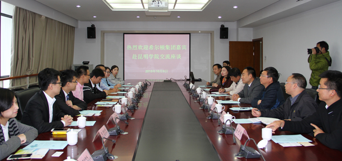 在办公楼311会议室,昆明学院副校长郭华、校长助理马银海、招就处处长包兴、教务处副处长常进荣、旅游学院院长田芙蓉、党总支副书记杨光明、副院长吴跃辉同希尔顿酒店集团全球代表Will秦、抚仙湖希尔顿酒店人力资源部经理Daniel王、西双版纳万达希尔顿逸林度假酒店人力资源部总监Eric朱、大理实力希尔顿酒店前厅部经理David张、深圳蛇口希尔顿南海酒店人力资源部总监Shirley周、深圳大中华希尔顿洒店人力资源部经理Frida严、厦门希尔顿逸林洒店人力资源部经理Fanny方、无锡灵山元一希尔顿逸林酒店人力资源部总监Sean邵、常州新城希尔顿洒店招聘部经理CherrV曲进行了交流座谈。座谈会由旅游学院院长田芙蓉主持。