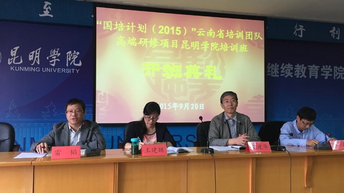 9月20日上午,“国培计划(2015)”云南省培训团队高端研修项目昆明学院培训班开班典礼在昆师路校区继续教育学院隆重举行。云南省教育厅副厅长王建颖,昆明学院副校长董建华,云南省教育厅师范教育处处长雷韬等领导出席,近200名学员参加了开班。典礼由继续教育学院院长陈嘉主持。