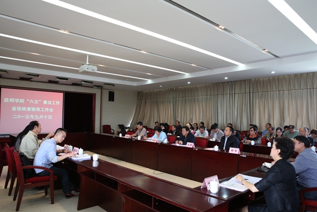 经过实事求是、客观公正的检查验收评分,检查验收组在反馈意见时给予我校“六五”普法工作较高的评价和肯定。潘兴顺肯定说,昆明学院普法工作一是领导重视,思想统一。不仅学校成立了由书记、校长任组长的法治宣传教育领导小组,学校每个基层单位也都成立了相应的普法领导小组、安排了具体普法工作人员,并能按要求统一地开展工作。二是重点突出,客观实际。学校既能按照全省统一的普法要求开展普法工作,又能结合高校的实际和职能,据教师、学生的所需,教学院系抓住了“法律进学校”的主体开展普法,职能部门又能突出落实“谁主管谁普法 谁执法谁普法”的工作重点。三是工作突出,措施有力。学校整个普法工作既有工作规划、工作实施方案,又有工作落实安排、督促检查措施和工作结果通报等措施和办法。四是成效凸现,稳定安康。学校多年来一直保持无重大校园事故,领导干部、教师无违纪情况,被云南省纪委、省监察厅命名为第一批云南省廉政文化示范点;多年获省、市“平安校园”、“平安建设先进单位”、“文明学校”、“文明单位”荣誉称号;2014年还荣获“全国‘六五’普法中期先进单位”,2015年荣获第四届“全国文明单位”。这些成绩、荣誉的取得,充分体现了学校普法工作做得实、做出了成效。只有普法工作做好了,师生的法律素养才能得到全面提高,才会有好的校园文明形象,校园才能更加安康。