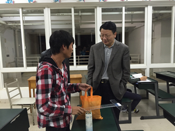 在澄明苑四栋城乡建设与工程管理学院的学生宿舍,陈世波与来自省内外各地的新同学进行深入交谈。陈世波详细询问了同学们填报昆明学院、选择所学专业等的初衷,到学校后参加军训的体会,对即将开始的大学生活、学习的期待和打算,以及同学的家庭经济状况、是否存在困难等情况。