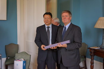 此访是继今年5月20日云南省人民对外友好协会安排爱尔兰克莱尔郡郡长约翰.克罗率代表团一行7人访问我校后,我校首次回访利默瑞克大学。利默瑞克大学高度重视我校代表团的访问,在利默瑞克大学举办的隆重热烈的欢迎仪式上,该校为代表团升起了中国国旗,利默瑞克大学有关领导、克莱尔郡郡长和副郡长以及其他议员一行7人全程参加接待和座谈,座谈双方就交流合作事宜进行交流和磋商。利莫瑞克大学合作事务处处长EamonnCregan先生代表该校向代表团的到访表示热烈欢迎,他详细介绍了利默瑞克大学的办学理念和特色,真诚希望两校能建立友好合作关系;该校国际学生事务部执行长Emmeline Searson女士向代表团介绍了该校国际学生的具体情况,热情期待昆明学院的学生到该校学习深造。陈世波对利默瑞克大学在假期间抽出宝贵的时间热情接待昆明学院代表团表示真诚的感谢,他全面介绍了昆明学院的情况,希望依托“昆明学院爱尔兰中心”,在优势学科共建、联合科研、教师互派及培训、学生交流和攻读学位等方面,开展两校的合作与交流,并提出在利默瑞克大学建立孔子学院的设想。EamonnCregan先生表示,两校在学科及师生交流方面有很大的共性和发展交流空间,对于在该校建立孔子学院的设想表示赞赏,表示将及时向校方通报并反馈情况。通过会谈,双方就师生交流互派、攻读学位、利用网络平台联合科研等方面达成合作意向,双方希望尽快开展具体合作。陈世波邀请对方在方便的时候再访昆明学院,并在留言本上提写“中爱友谊”的祝愿,赢得大家的热烈掌声。