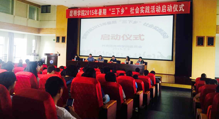 为深入学习宣传贯彻党的十八大和十八届三中、四中全会以及习近平总书记系列重要讲话精神,引领广大青年学生按照习近平总书记关于“勤学、修德、明辨、笃实”的“八字真经”要求,树立和践行社会主义核心价值观,更加坚定跟党走中国特色社会主义道路、为实现“四个全面”战略布局和中国梦努力奋斗的理想信念,学校决定开展昆明学院2015年大学生暑期“三下乡”社会实践活动。校团委于7月3日中午在惟行楼1501“三下乡”启动仪式。