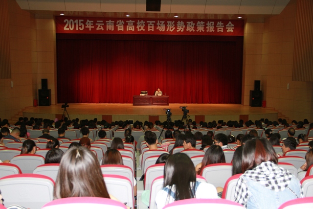 6月19日下午,学校2015年云南省高校百场形势政策报告会在学生会堂举行。中共云南省委党校、云南行政学院党委委员、公共管理教研部主任欧黎明教授应邀为我校师生作题为“全面从严治党与高校党的建设”的专题报告。学校党委副书记孙勇、副校长李翔、中层干部、学校思想政治教育宣讲团成员、各党总支(直属党支部)师生党员代表共1300多人参加报告会。