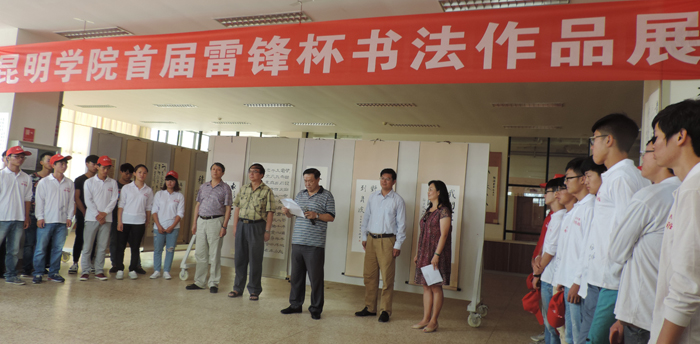 6月24日上午,昆明学院首届”雷锋杯”书法作品展开幕式在图书馆二楼展厅隆重举行。开幕式由城建学院党总支书记晁丽华主持,校党委副书记孙勇出席开幕式并讲话,学生工作部(处)长刘宜萍、党委宣传部主持工作副部长董学荣、城建学院院长徐从发和城建学院“雷锋班”全体同学以及部分书法爱好者参加了开幕式。