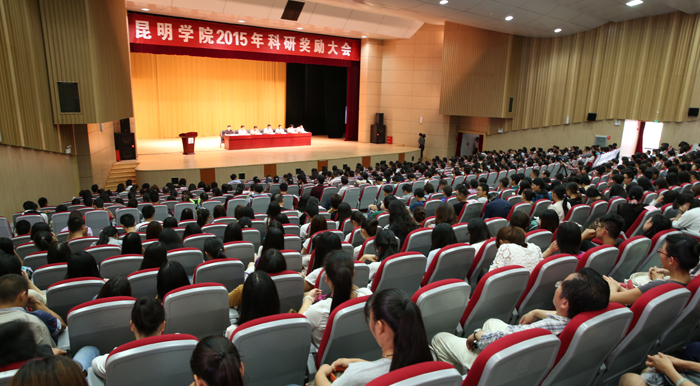 参加奖励大会的还有党委副书记、纪委书记李媛芬,副校长刘海发。学校全体中层干部,具有副高及以上职称、博士、硕士学位的教师,获科研奖励全体教师,获2014年大学生优秀科研项目奖励的全体学生,承担有昆明学院大学生科研项目的学生及指导教师,各院系团总支书记、科研秘书、科研联络人和专任教师、学生代表,共计1300余人参加了奖励大会。